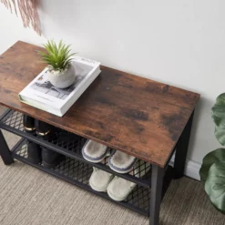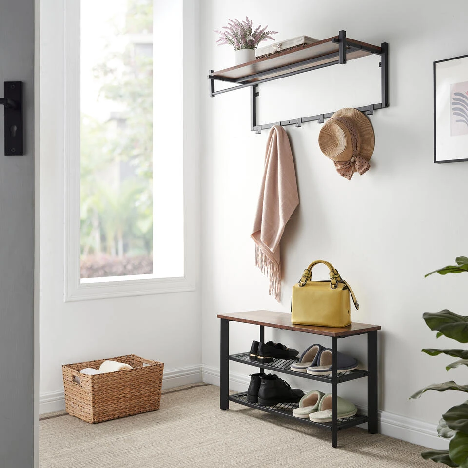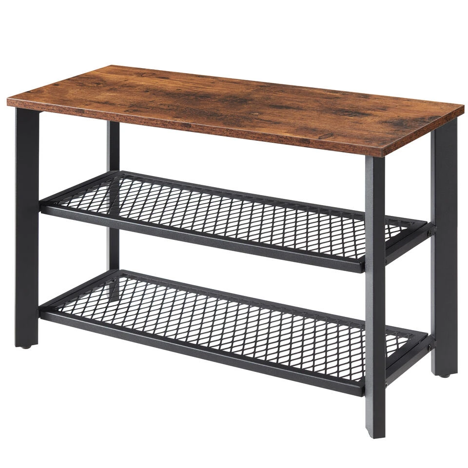 Dankzij de twee metalen roosters van dit schoenen rek is er voldoende plaats om jouw favoriete sneakers netjes op te bergen. Je kan op die manier tot wel acht paar schoenen verzamelen. Het solide metalen frame en het kwalitatieve houten blad zorgt ervoor dat je op het bankje kan plaatsnemen om je schoenen aan te trekken.