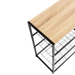 Dit schoenenrek met houten plank zal altijd van pas komen. De mooie bleke afwerking van de plank zal u zeker weten te bekoren. Bovendien kan u tot wel 9 paar schoenen op de 3 metalen rasters kwijt.