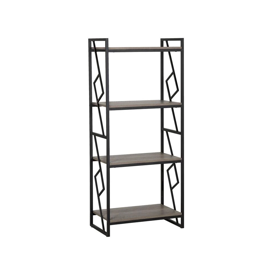 Boekenkast 4 compartimenten in industrieel ontwerp. Deze functionele kast biedt voldoende ruimte voor jouw favoriete boeken, foto’s en decoratieve items. Het is gemakkelijk om orde op de vier stevige planken te houden. De combinatie van hoogwaardig gelamineerd spaanplaat met houteffect en stevig glanzend metalen frame in zwart ziet er luxe uit en past in alle woonruimten.