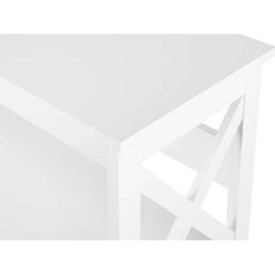 Moderne boekenkast in industriele stijl. Voeg een vleugje industrieel design toe aan je huis met deze stijlvolle boekenplank. Strakke lijnen, een stevige constructie van fijne witte MDF en de X-vormige stutten aan de zijkanten maken deze plank een must voor iedereen die van designmeubels houdt. Op de vier brede, stevige planken vinden jouw favoriete boeken en sieraden altijd een plek en met zoveel praktische opbergruimte is het eenvoudig om alles geordend te plaatsen. Een moderne, industriële toevoeging aan jouw huis, precies waar je het nodig hebt – in de woonkamer, slaapkamer of studeerkamer, in de hal of in de keuken.