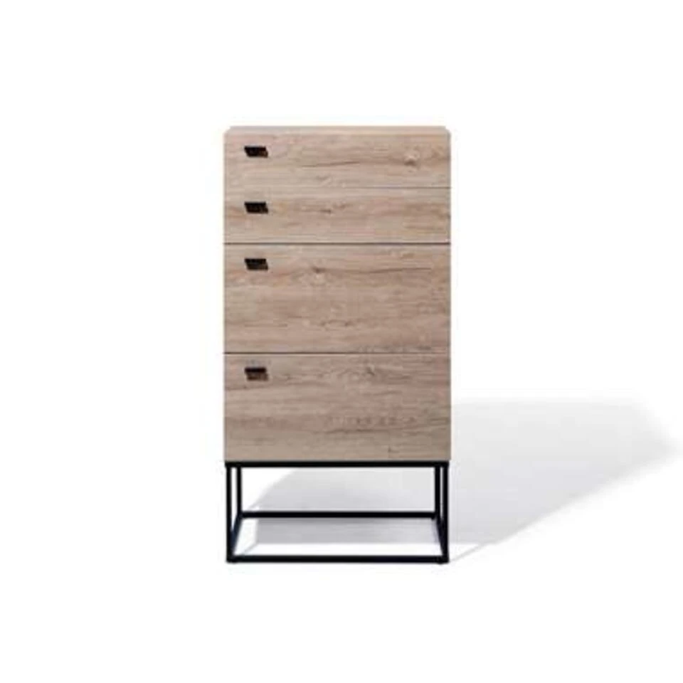 Melkkast in industriële stijl met 4 lades. Het rechtlijnige design en industrieel ontwerp geven deze kast zijn individualistische karakter. Dankzij de hoge, smalle vorm biedt het veel opbergruimte zonder veel ruimte in beslag te nemen. De praktische ladekast kan worden gebruikt in alle woonruimtes en ook in de studeerkamer of op kantoor. Twee kleinere en twee grote laden met smalle handgrepen van zwart metaal zorgen voor orde. De mooie houtkleur wordt gecombineerd met een stevige, gepoedercoat metalen frame in zwart. De kleuren- en materiaalmix van metaal en hout geeft het dressoir zijn trendy en expressieve uitstraling en zorgt ervoor dat het er echt goed uitziet, zowel in moderne en industriële inrichtingsstijlen als in een rustieke ambiance!