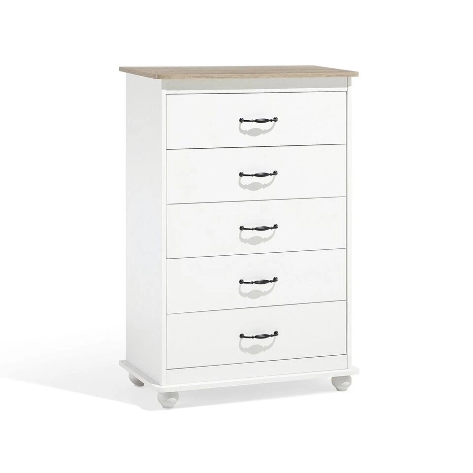 Decoratieve kast met 5 lades in rustieke stijl. De prachtige ladekast in de witte landhuisstijl straalt een huiselijke sfeer, gezelligheid en oneindige charme uit. De decoratieve ladekast van robuust MDF hout van hoge kwaliteit en eiken gefineerd, is multifunctioneel in alle woon- en werkruimtes. Uitgerust met vijf grote, ruime laden met smalle handvatten gemaakt van donker metaal, biedt de praktische ladekast volop ruimte en opslagruimte. Voor alle liefhebbers van traditionele meubels in een charmante landhuisstijl!
