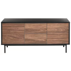 Moderne woonkamer highboard kast met lades. Verbeter de stijl van je interieur met dit praktische dressoir. Dankzij de hoogwaardige spaanplaatconstructie met stalen poten is hij duurzaam en onderhoudsvriendelijk. De combinatie van donker hout en zwart maakt dit dressoir een perfecte toevoeging aan elk modern of traditioneel interieur. Twee kasten met planken en lades bieden extra opbergruimte en helpen je om je ruimte opgeruimd te houden.
