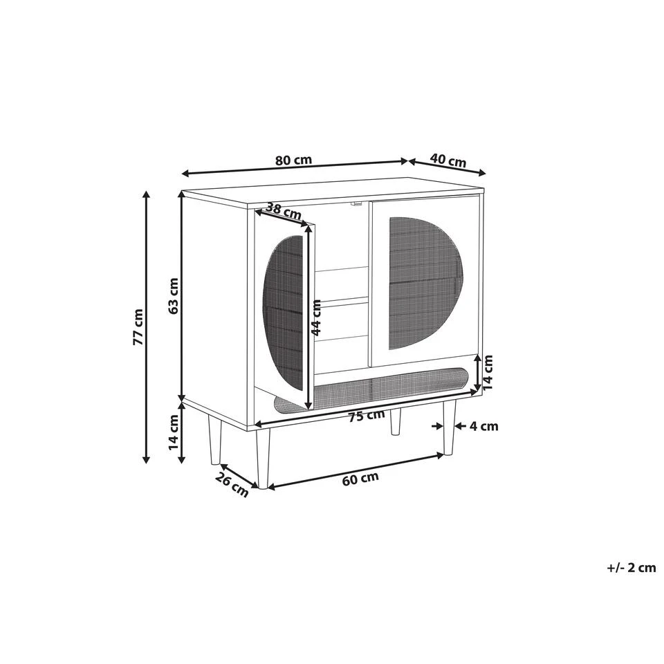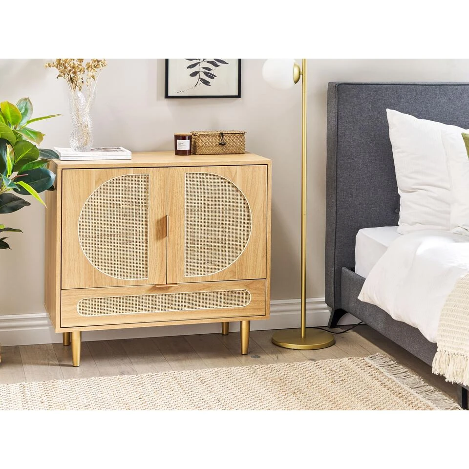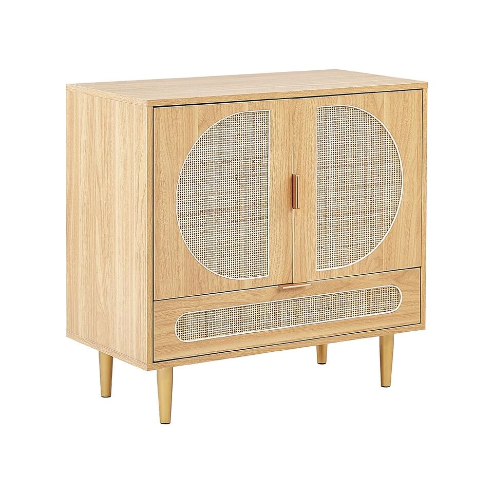 Kast met rotan frontjes. Geïnspireerd door de boho-trend, is dit dressoir met 2 deuren een fantastische aanvulling op alle moderne woonruimtes. De natuurlijke uitstraling, met een houtachtige afwerking en rotan fronten, zal elk interieur opfleuren en een elegante uitstraling geven. De kast is gemaakt van MDF en spaanplaat en staat op stevige metalen poten. De planken bieden voldoende opbergruimte, terwijl de bovenkant perfect is voor het presenteren van ingelijste foto’s of decorstukken.