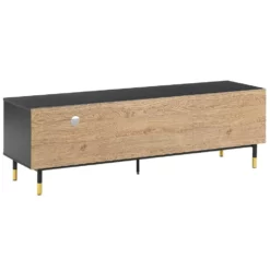 Tijdloos tv-meubel met industriële charme. Dit TV-meubel combineert alles wat belangrijk is in zulke meubels: functionaliteit, design en kwaliteit. Al je elektrische en televisieapparatuur, zoals dvd-spelers, ontvangers en luidsprekers kan je op de plank plaatsen en in de ruime kast past gemakkelijk je hele dvd- en gamecollectie. Dankzij het praktische gat kunnen alle lelijke kabels gemakkelijk achter de tv-standaard worden verborgen. De decoratieve en tegelijkertijd robuuste poten van gepoedercoat metaal in zwart geven dit tv-lowboard een industrieel tintje.