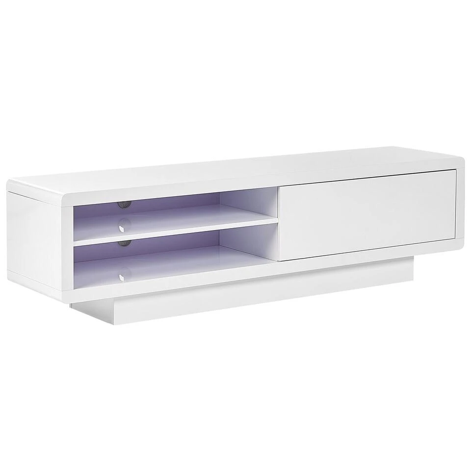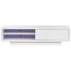 Minimalistische tv-kast met opbergruimte. Maak je woonkamer stijlvol en functioneel met dit lage tv-meubel, met twee open planken waar je al je apparatuur gemakkelijk kan gebruiken dankzij de ingebouwde kabelgoot. De diepe lade is perfect om je afstandsbedieningen, controllers en games op te bergen. De minimalistische kast heeft een hoge glans afwerking wat zorgt voor een moderne look.
