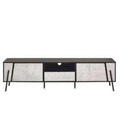 Trendy televisiekast met veel opbergruimte. De rechthoekige vorm en de contrasterende, schuine poten geven dit meubel een moderne touch met veel stijl. De kastfronten in betonlook zien er mooi uit met de matzwarte oppervlakken en maken van het lowboard een mooie en functionele kast voor je woonkamer.