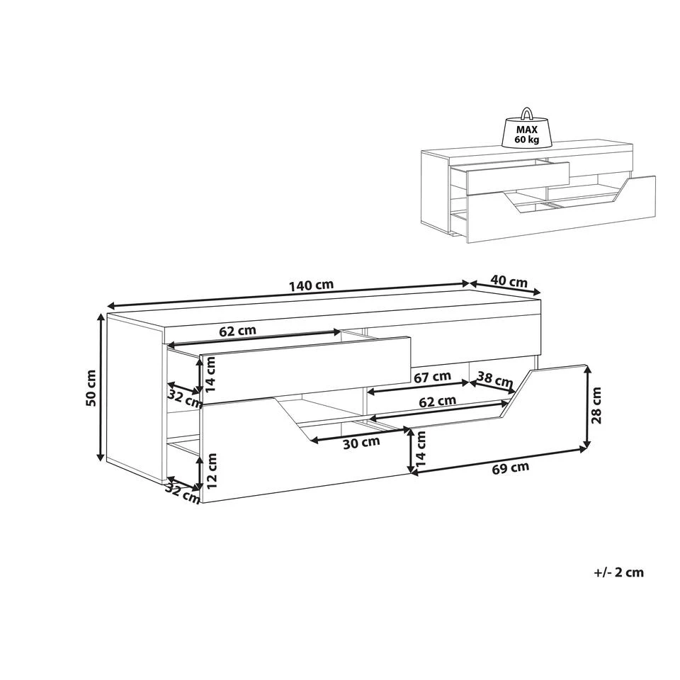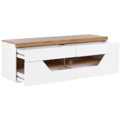 TV meubel voor een TV tot 60ΚΊ. Breng functionaliteit in je tv-kamer met dit stijlvolle meubel in het wit. Hij is gemaakt van stevig MDF en heeft vier lades waar je al je spulletjes in kunt opbergen. Dankzij de kabeluitsparingen zijn de planken perfect voor het opbergen van allerlei soorten mediaspelers.