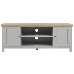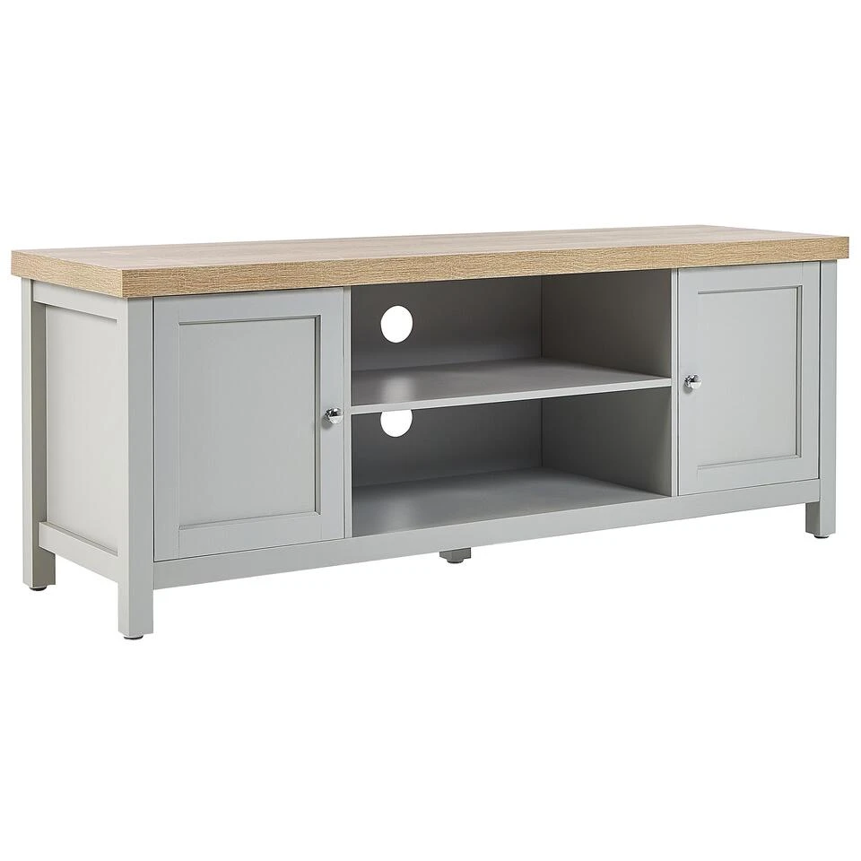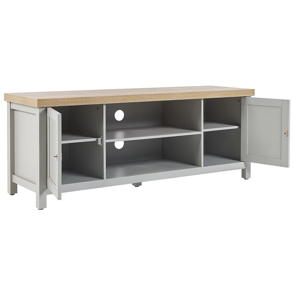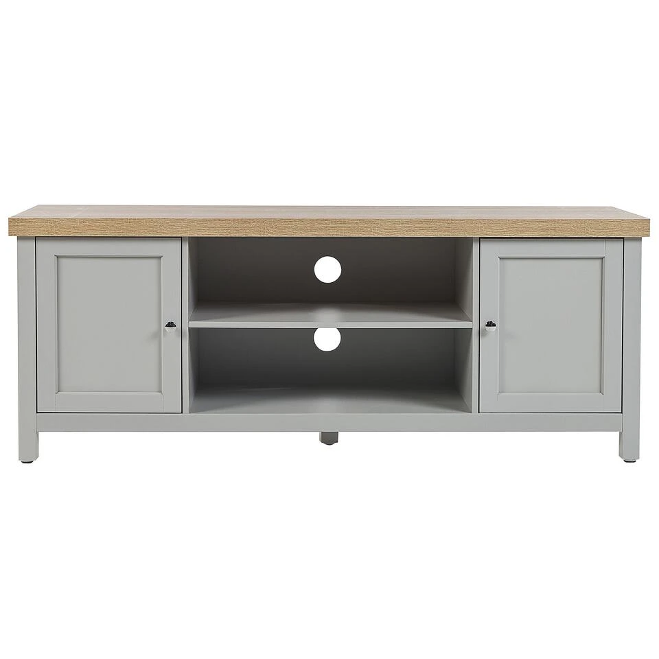 Scandinavisch TV-meubel voor tv’s tot 58ΚΊ. Deze rechthoekige TV-meubel biedt perfecte support voor een flat-screen TV, maar is ook uitstekend om accessoires te bewaren in een woonkamer. Gemaakt van spaanplaat van hoge kwaliteit in grijs met een bovenblad in een lichte houttint, past hij perfect in zowel traditionele als moderne interieurs. Het TV-meubel komt met 2 deuren, planken en snoermanagement, zodat je jouw kamer opgeruimd kunt houden.