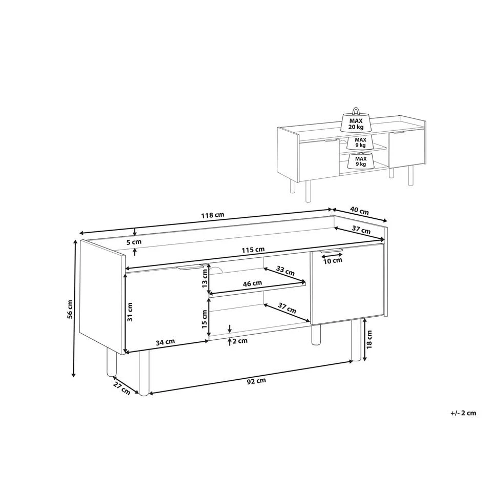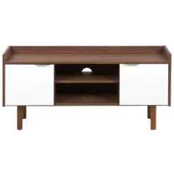 Elegant TV-meubel in Scandinavische stijl. De perfecte combinatie van functionaliteit en design! Dit exclusieve sideboard heeft een functioneel ontwerp met een mooie kleurencombinatie van een matte donkere houtkleur en klassiek, glanzend wit. De hoge kwaliteit kast heeft twee ruime vakken met verstelbare planken en deurtjes. In het midden zitten ook nog drie ruime lades.