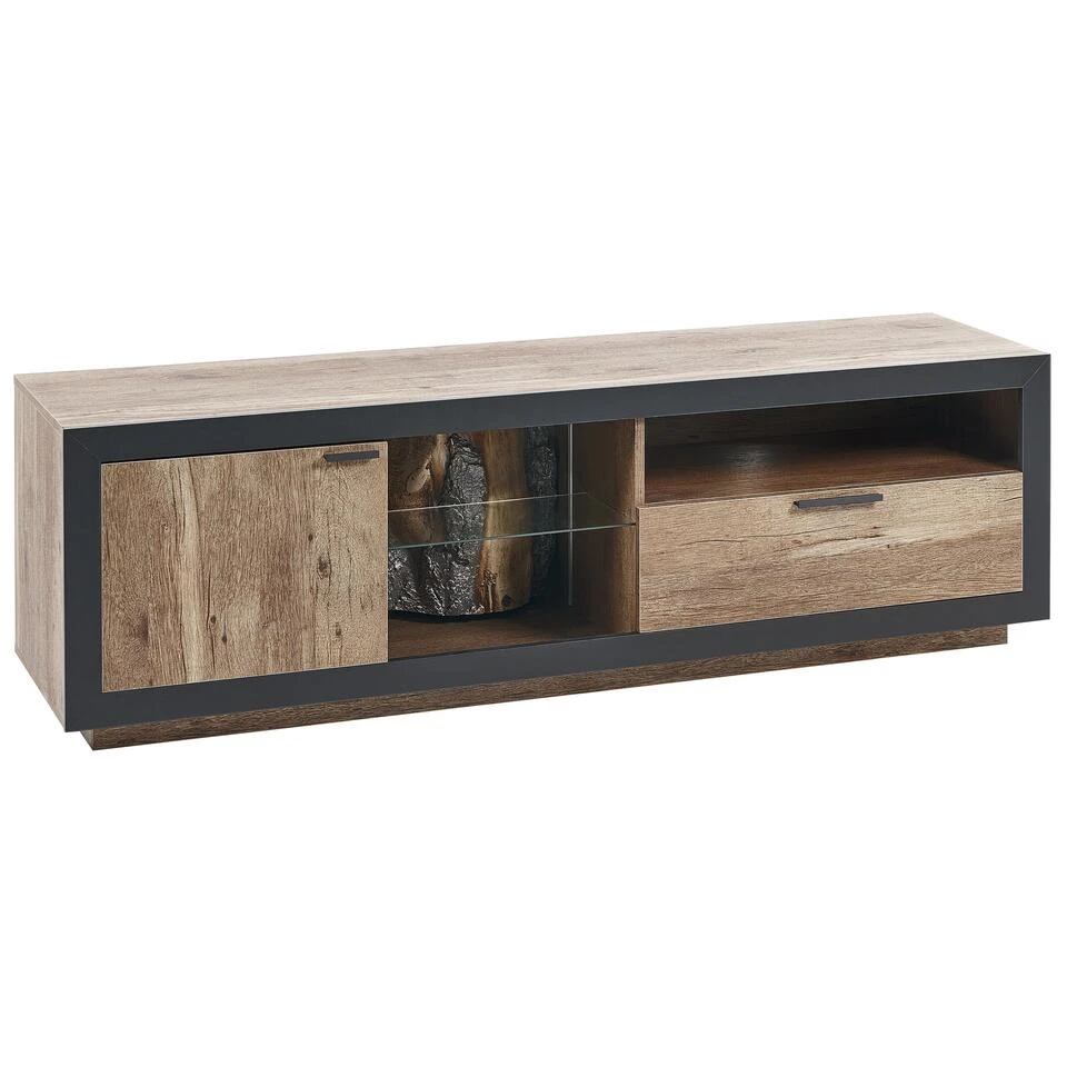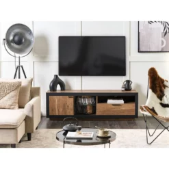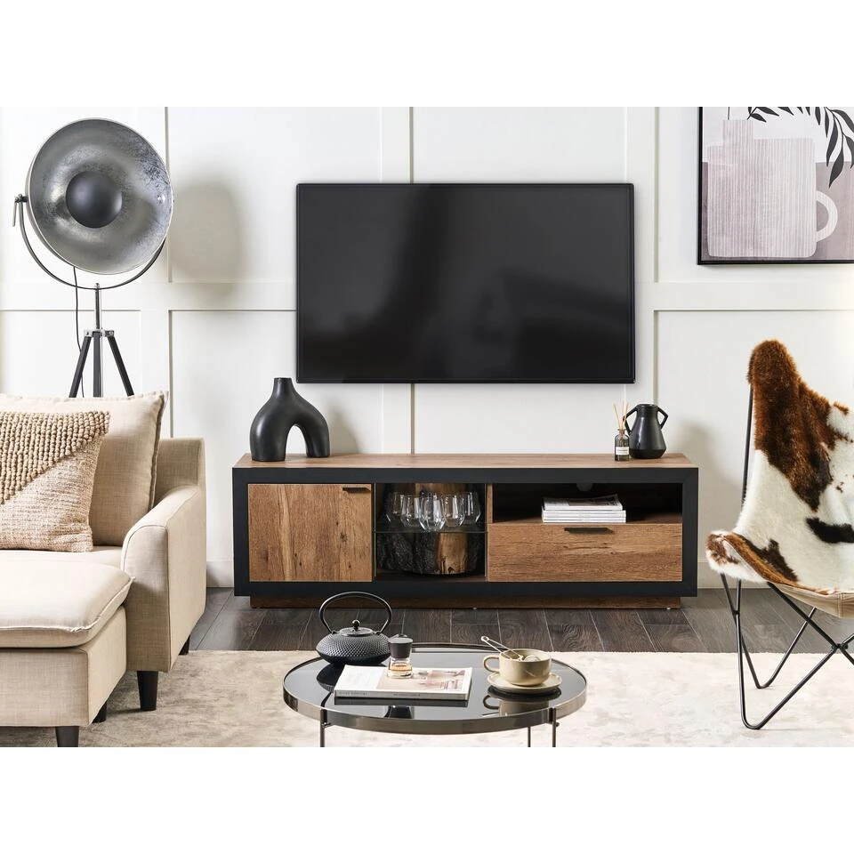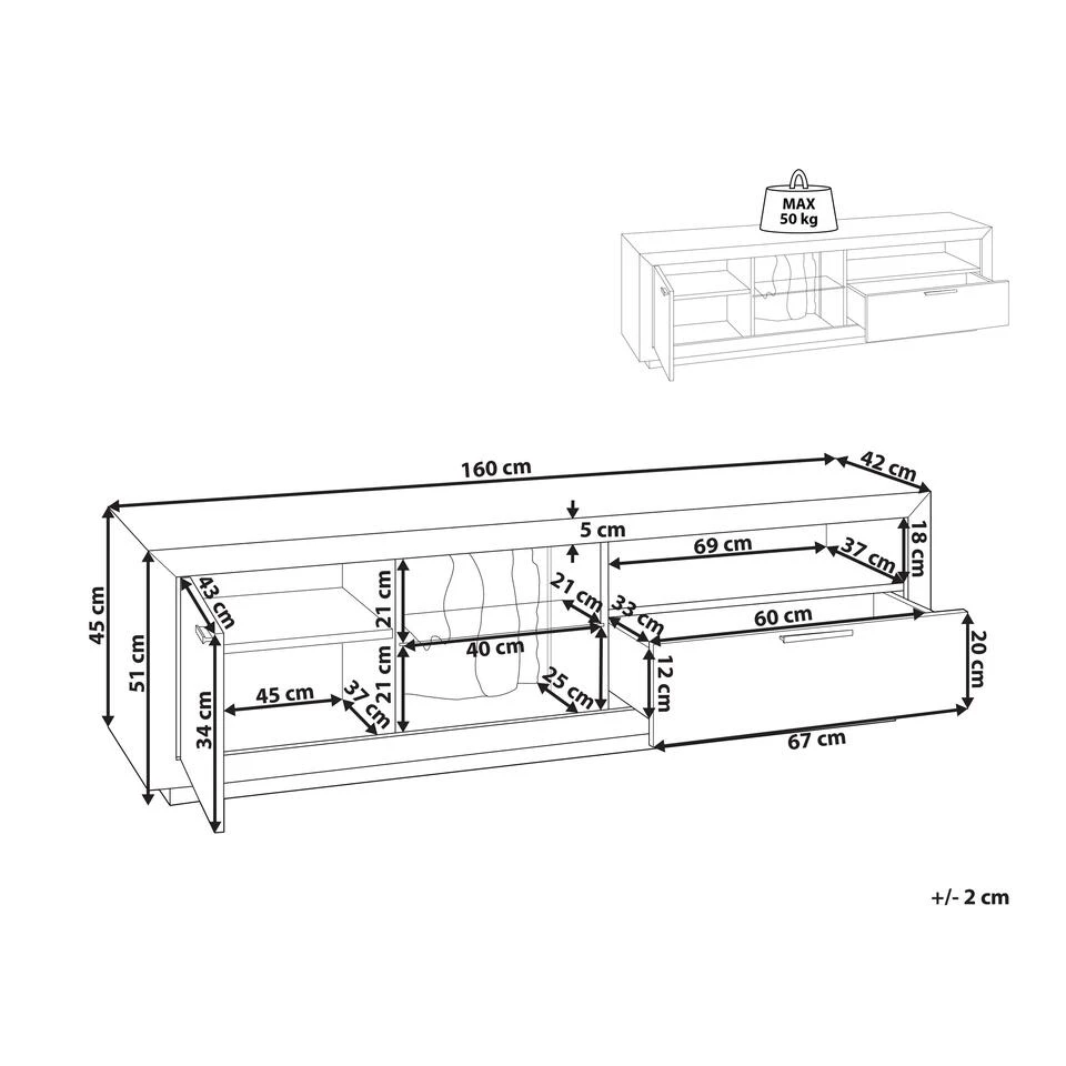 Kast met lade en verlichting voor een TV tot 55”. Breng stijl en een rustieke sfeer in je woonkamer met dit tv-meubel. De kast heeft een aandacht trekkende, kunstmatige boomstronk in het midden, die wordt geleverd met een LED-lampje – hierdoor kun je je kamer verlichten met aangenaam omgevingslicht. Bovendien kan het licht ook worden aangepast met behulp van een afstandsbediening – de helderheid kan naar boven of naar beneden worden ingesteld. Voor de stronk zit een glazen plank waarop je je favoriete decoraties of foto’s kunt uitstallen. Daarnaast heeft het meubel ook andere opbergruimte – een ruime lade en een kast met extra plank. Het is een geweldig idee om een tv op het meubel te plaatsen, aangezien de standaard een opening voor kabelbeheer heeft, zodat je al je kabels gemakkelijk kunt ordenen. Ten slotte vereist het stuk eenvoudig onderhoud en hoeft het niet dagelijks te worden schoongemaakt om vele jaren mee te gaan, omdat het is gemaakt van hoogwaardig MDF.