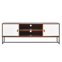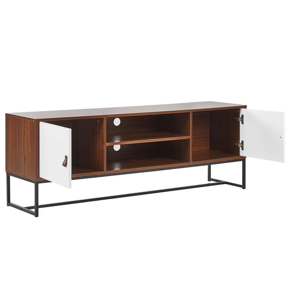 Modern TV-meubel hout/wit. Dit TV meubel met twee deuren is een goede keuze als je op zoek bent naar traditioneel meubelstuk met een moderne twist. Het is gemaakt van duurzaam MDF, hout, gecombineerd met witte frontjes. Het TV meubel heeft twee deuren en in het midden twee planken wat zorgt voor extra veel praktische bergruimte. Ook zijn er openingen aanwezig om eventuele kabels netjes weg te werken. De details maken dit TV meubel pas echt uniek, zoals de eco-leren handvatten en het visgraatpatroon in de frontjes.