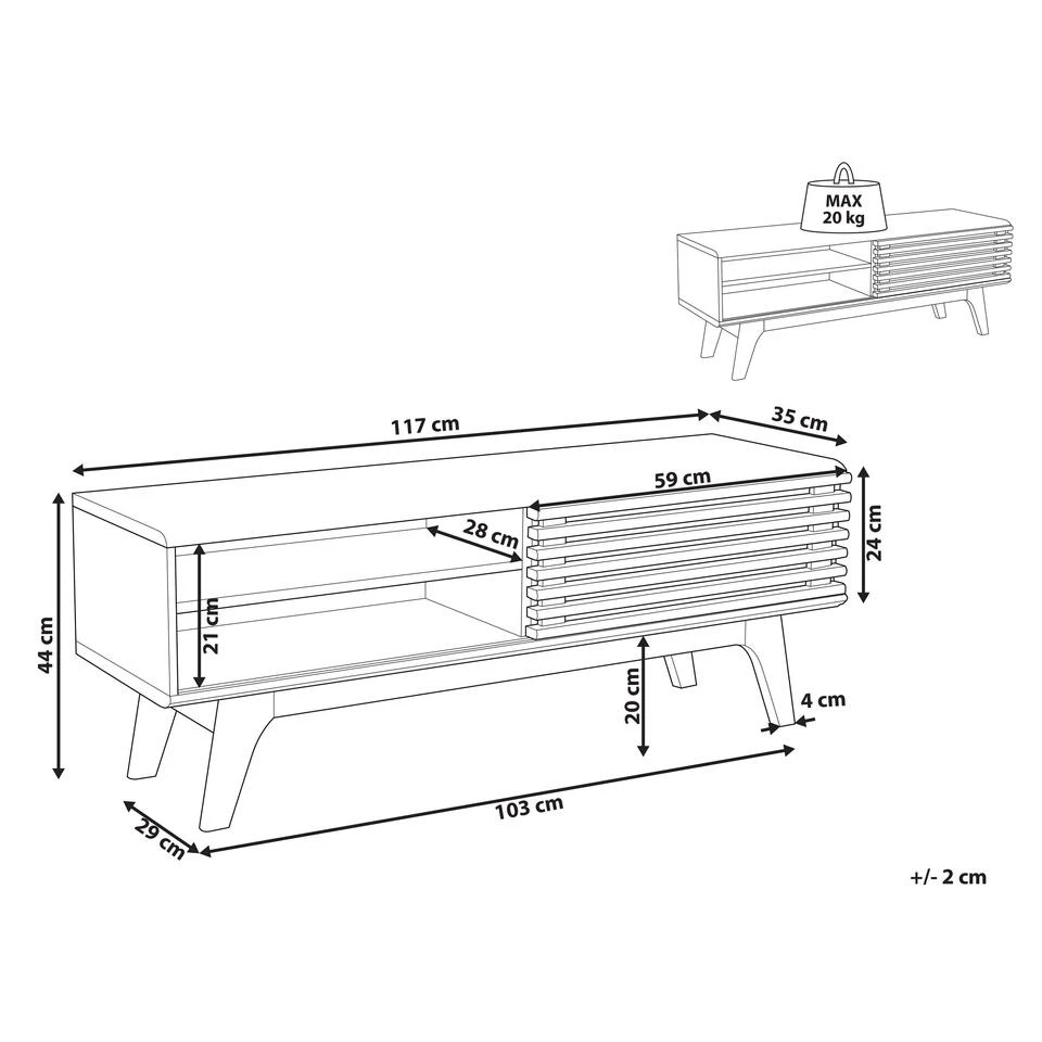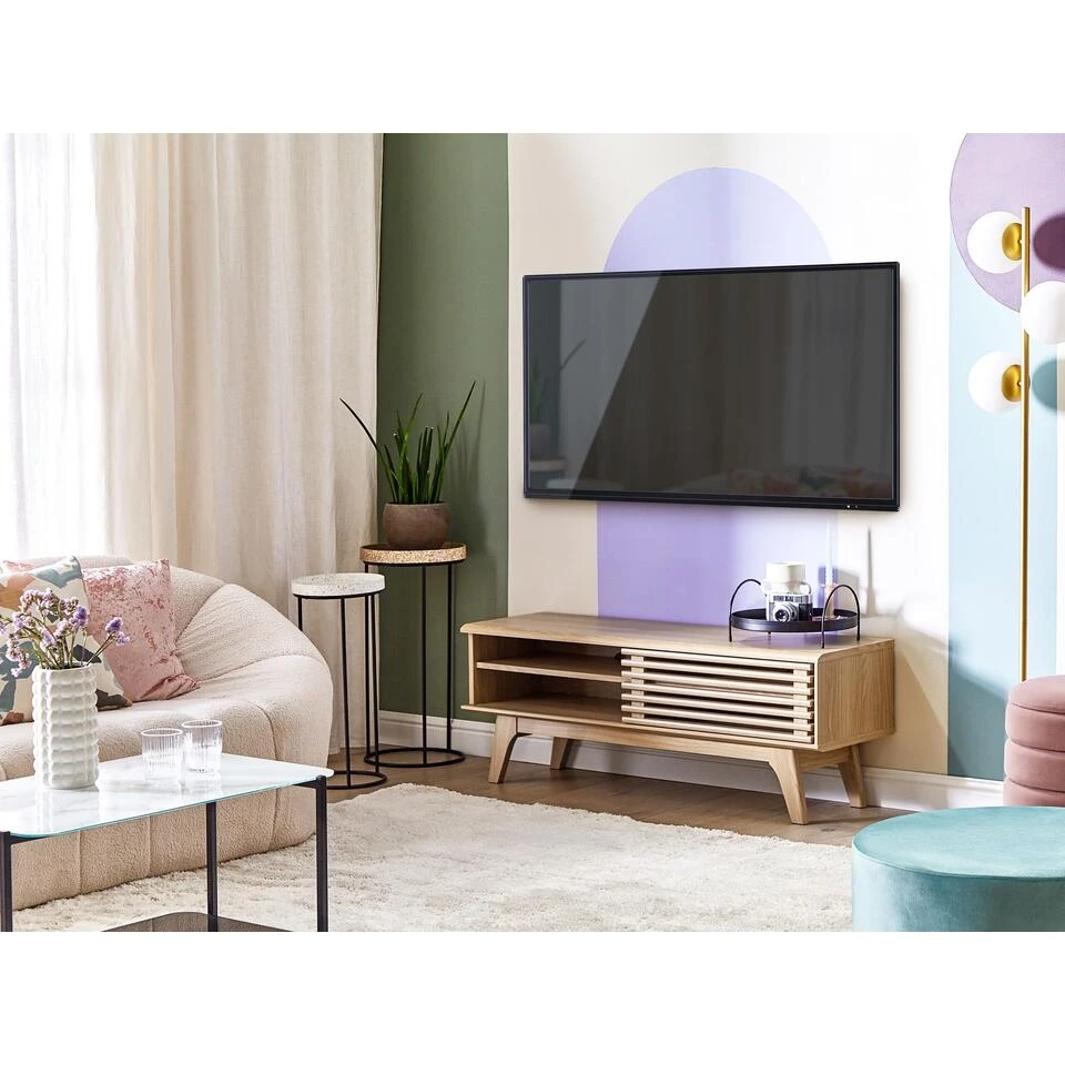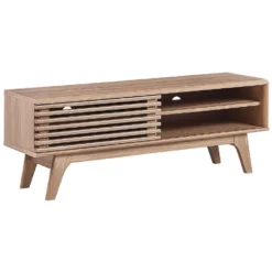 Geavanceerd tv-meubel. Dit TV-meubel heeft een zeer mooi design en een warme walnoottoon. Deze kast overtuigt door een elegante uitstraling en hoogwaardige kwaliteit. Dit mediameubel heeft twee vakken met elk in hoogte verstelbare inlegplanken. Met een kleine schuifdeur is steeds ÊÊn van beide vakken af te sluiten. De stroken die op kleine afstand van elkaar aan de schuifdeur zijn bevestigd, geven dit kastje een open karakter.