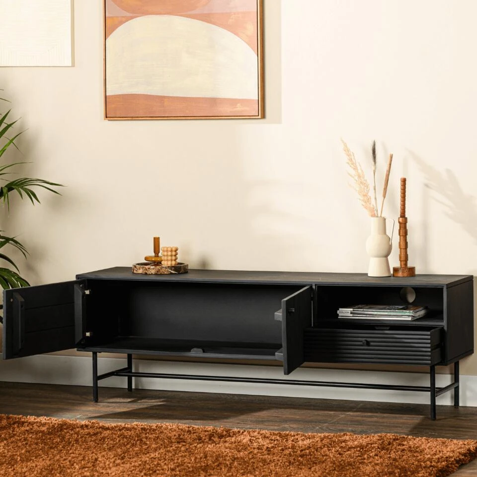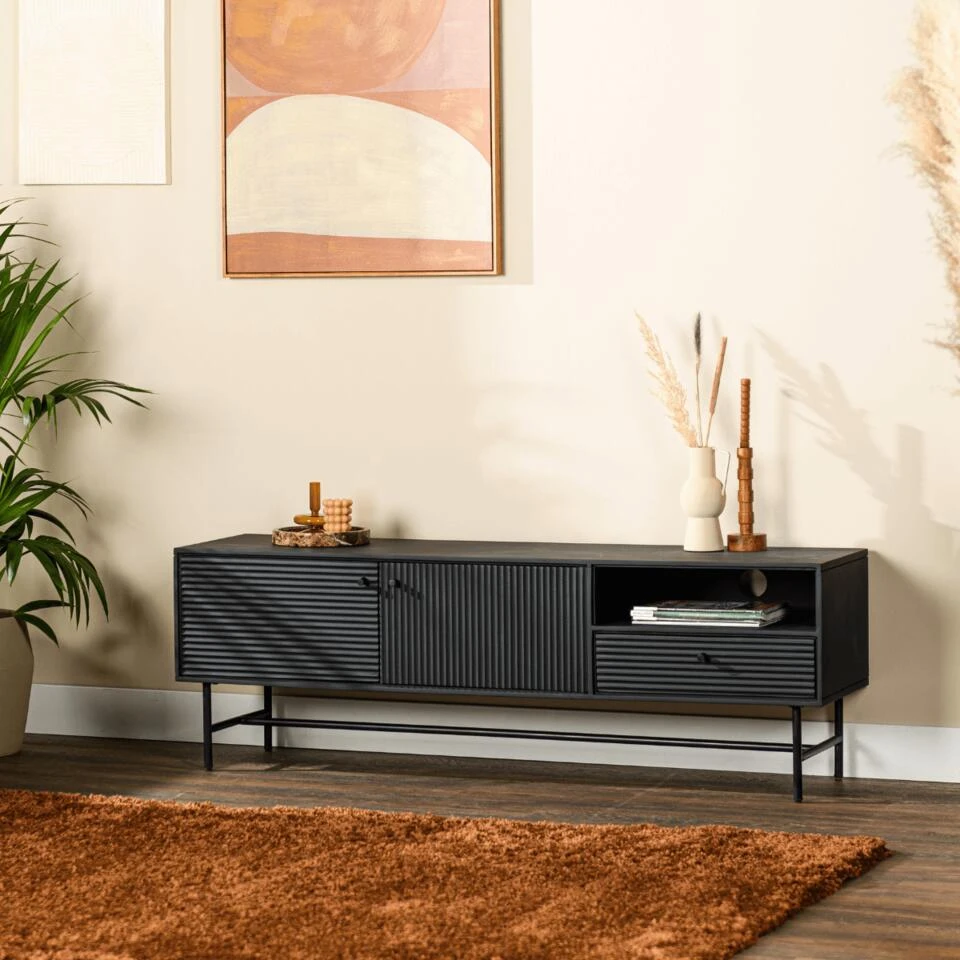 De Bina tv-meubel van Vurna is een stijlvolle en functionele toevoeging aan elke moderne woonruimte. Met een lengte van 150 cm biedt dit tv-meubel voldoende opbergruimte voor al je media-apparatuur en accessoires. Het meubelstuk is uitgevoerd in een elegante zwarte kleur die past bij vrijwel elke interieurstijl. Het tv-meubel is gemaakt van duurzaam acaciahout, wat betekent dat het meubelstuk jarenlang meegaat en bestand is tegen dagelijks gebruik. Het ontwerp is strak en modern, met prachtige ribbelpatronen op de kastdeuren en een subtiel onderstel dat mooi past bij het bovenstuk. Naast zijn esthetische kwaliteiten biedt de Bina tv-meubel ook praktische voordelen. Het meubelstuk heeft verschillende opbergvakken waarin je al je spullen ongezien kunt opbergen terwijl je tv kijkt. De brede bovenkant van het meubelstuk biedt ook voldoende ruimte om andere spullen zoals een vaas of fotolijst te displayen. De Bina tv-meubel is ideaal voor moderne interieurs, maar past zich ook gemakkelijk aan andere interieurstijlen aan dankzij zijn rustige en neutrale uitstraling. Dit tv-meubel is perfect voor mensen die op zoek zijn naar een stijlvolle maar ook praktische meubelstuk.