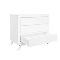 De commode Anne van Bopita heeft een retro-look door de elegante, schuin geplaatste poten. De laden hebben een front van robuust MDF en zijn greeploos uitgevoerd. Het hout van deze ladenkast is afkomstig uit Europese bossen. De gebruikte lakken zijn op waterbasis wat veilig is voor kinderen en milieuvriendelijk. De drie ruime lades zijn voorzien van een softclose mechanisme, waardoor de lades zachtjes sluiten. Op deze commode is de barrier Square te plaatsen. Een barrier, ook wel bladvergroter genoemd, zorgt ervoor dat jouw baby recht voor je ligt, wat het verschonen eenvoudiger maakt. Combineer deze commode eveneens met het wandrek Anne. Deze plaats je boven de commode, waardoor je verschillende verschoonartikelen eenvoudig bij de hand hebt. Barrier en wandrek zijn niet inbegrepen.