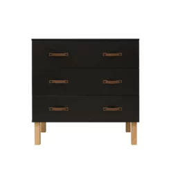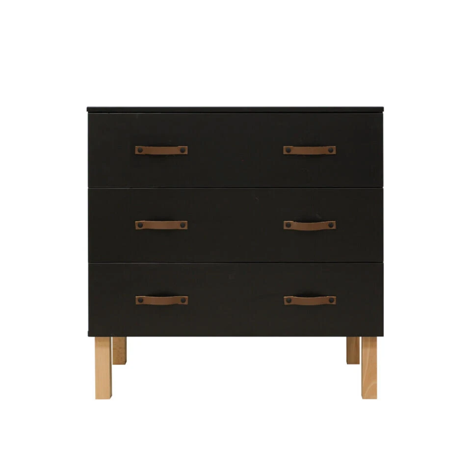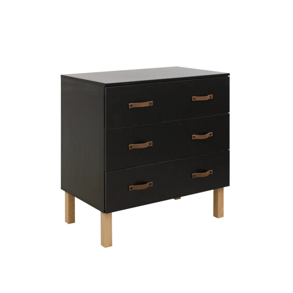 Commode uit de serie Floris met 3 laden voorzien van leren handgrepen. De commode staat op beuken pootjes. Te combineren met de barrier Uno en het wandrek van de serie Floris.