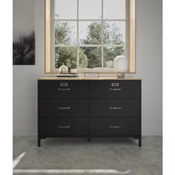 Met zijn 6 laden biedt deze commode een geoptimaliseerde opbergruimte voor het opbergen van uw kleding en dagelijkse spullen. Het is ideaal voor kleine slaapkamers vanwege de beperkte afmetingen. De ABS-poten in de kleuren zwart en Helvezia-eiken zorgen voor optimale stabiliteit.