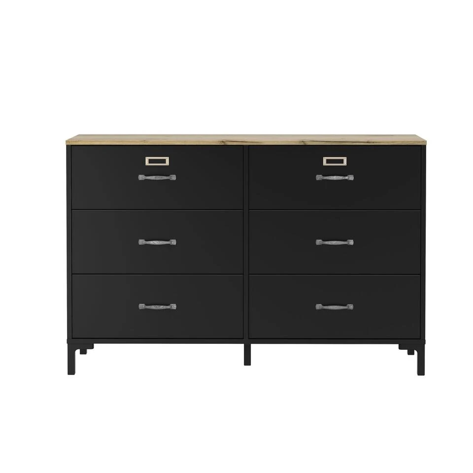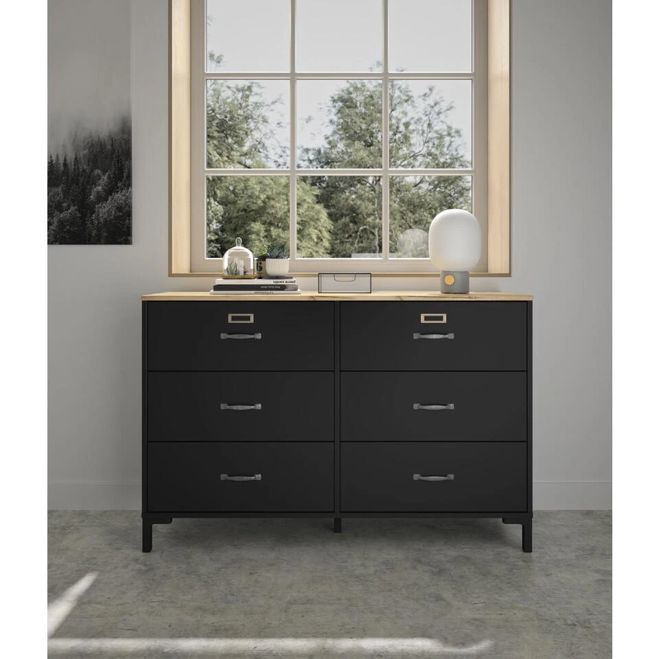 De commode met 6 laden MANCHESTER is een nachtkastje van Franse makelij uit Vendée. Het tweedelige ontwerp in zwart en eikenhout geeft een industriële uitstraling aan uw slaapkamer. De bovenste twee laden zijn voorzien van een metalen labelhouder om uw spullen gemakkelijk te kunnen sorteren. De handgrepen van verouderd ABS voegen een vleugje charme toe aan deze commode.