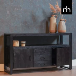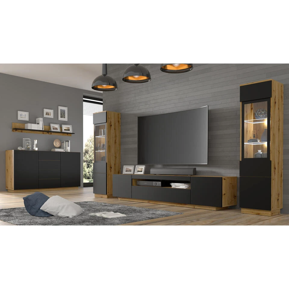 De gepresenteerde ladekast uit de AURA-collectie is gemaakt in een moderne stijl en kleurstelling. De combinatie van een houtdecor met matzwart zal harmoniëren met verschillende interieuropstellingen zoals een woonkamer, eetkamer, slaapkamer of jeugdkamer. Een eenvoudige body, voorzien van greeploze fronten, maakt het meubel aantrekkelijk en opvallend.