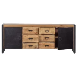 Een stoer dressoir met deurtjes die geïnspireerd zijn op de traditionele lockerkast. De combinatie van het warme mangohout en het zwarte staal maakt het dressoir een aanwinst voor jouw interieur. Het dressoir heeft veel opbergruimte in de zes lades en dubbele vakken achter beide stalen deurtjes.