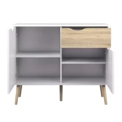 Dressoir Delta is een moderne kast geschikt voor de hele woning. De witte/eikenkleurige kast heeft twee deuren met daarachter twee vakken en 1 schuiflade. Genoeg plaats om allerlei spullen in op te bergen. Wil je een grotere maat? Geen probleem, dressoir Delta is ook verkrijgbaar in een 4-deurs.