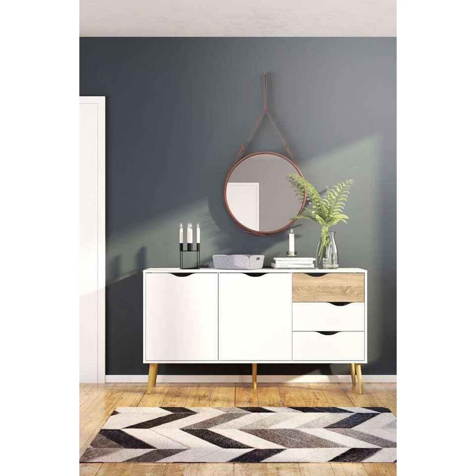 Dressoir Delta is een moderne kast met 5 vakken. De 5 vakken zijn opgedeeld in 2 deuren en 3 lades. Deze witte/eikenkleurige kast heeft genoeg ruimte voor al je spullen! Wil je liever een kleinere Delta kast? Geen probleem, dressoir Delta is er ook in een 3-vaks.