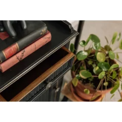 Dit compacte houten dressoir heeft een deur met een legplank en een lade om al je kleine spulletjes in op te bergen. Bijzonder is ook het opstaande randje van het bovenblad, dat een uniek element toevoegt. Dit kleine zwarte vintage kastje heeft ook een wit broertje, dat er dankzij de kleur meteen compleet anders uitziet! Om je keuken, woonkamer of hal helemaal af te maken, bieden we ook een bijpassend medium-dressoir in zwart of wit aan, met dezelfde houten details. Hoe leuk is het om deze stijl consequent door te voeren?