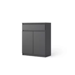 Dressoir Naia is een moderne kast voor in de woonkamer, maar ook in de slaapkamer staat deze kast mooi. De Naia heeft een strakke vormgeving en is mat zwart van kleur. Deze ruime en praktische kast staat goed in elk modern interieur. Berg alles netjes op in dressoir Naia. Dit praktische en stijlvolle meubel is gemaakt van spaanplaat.