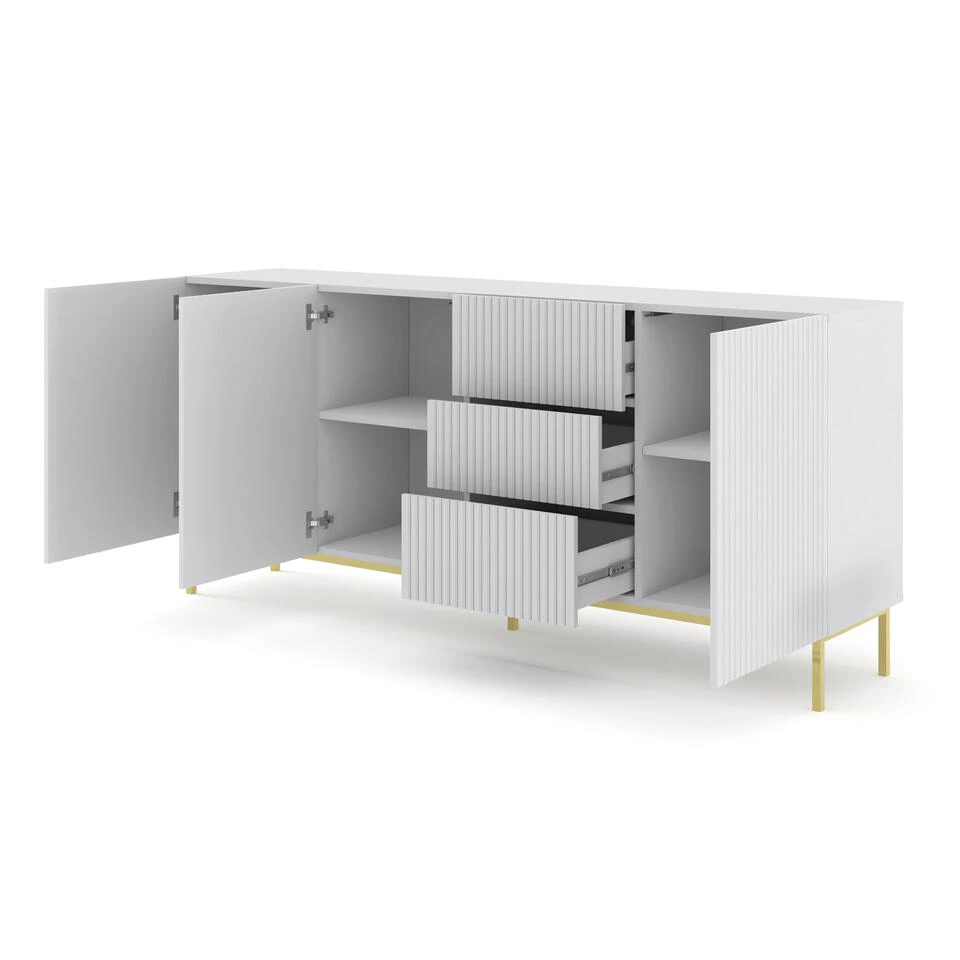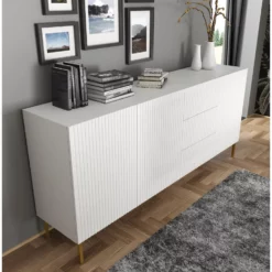 Meubels uit de gepresenteerde Ravenna-collectie worden gekenmerkt door elegantie en een uniek uiterlijk. Ze zullen geschikt zijn voor moderne arrangementen en het interieur van de woonkamer of eetkamer veranderen. De eenvoud van de vormen harmonieert perfect met de gefreesde fronten. Het metalen frame ondersteunt de body zorgt voor stabiliteit en voegt stijl en expressiviteit toe.