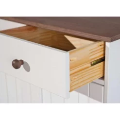 Dressoir Westerland is kwaliteitsvolwandmeubel met een landelijke look. Gemaakt van massief grenen, met hout afkomstig van duurzaam beheerde plantages. Deze kast is voorzien van 2 deurtjes en 2 lades. De lades zijn gemonteerd op schuivende ladegeleiders en verlengen de levensduur bij veelvuldig gebruik. De kleurstelling is een combinatie van wit met bruin in de kleur beuken.