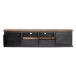 Tv-meubel Jake 200cm beschikt over 2 kastjes, 2 lades en een open vak. Het blad aan de bovenkant en van het open vak is van mangohout. Dit gecombineerd met het zwart metalen frame geeft je interieur een stoere, robuuste uitstraling.Tv-meubel Jake is 200 cm breed en beschikt over een gat aan de achterkant om alle kabels netjes weg te werken. Perfect dus ter ondersteuning van jouw televisie.