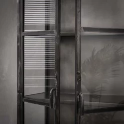 Deze vitrinekast heeft veel weg van onze Rift-serie. Echter door het veelvuldig gebruik van gun metal, wordt dit exemplaar Rift Metal genoemd. De vitrinekast is voorzien van 2 glazen deuren en 3 schappen. Vitrinekast Rift metal wordt opgebouwd geleverd.