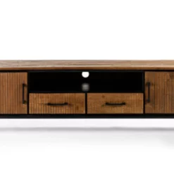 Dit trendy TV-meubel is gemaakt van hoogwaardig acaciahout en heeft een zwart metalen onderstel. Het meubel is naast dat het heel praktisch is ook nog is een echte eye-cachter bij jou in de woonkamer. Het hout heeft is afgewerkt met een donkere lak en dit zorgt in combinatie met de uitsnedes in het hout voor een luxe look. Het TV-meubel beschikt over 6 gesloten vakken en 1 groot open vak. Ideal dus om spullen in op te bergen. De deurtjes sluiten doormiddel van een magneet dus zij zullen niet zomaar opengaan. Dit meubel is ook in een kleinere variant verkrijgbaar.