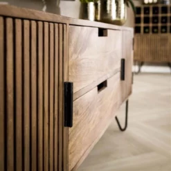 Het industriële TV-meubel is gemaakt van massief mangohout. Het mangohout heeft een duidelijk zichtbare houtstructuur, waardoor de Tory een stoere en levendige uitstraling krijgt. Het mangohout heeft een lichte basiskleur en kenmerkt zich door ruige en donkere accenten.