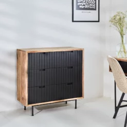 Industriële ladekast Felix is gemaakt van mangohout. Het mangohout heeft een duidelijk zichtbare houtstructuur, waardoor de wandkast een stoere en levendige uitstraling krijgt. Het mangohout heeft een lichte basiskleur en kenmerkt zich door ruige en donkere accenten. De lades van de Felix zijn zwart geverfd. Op zoek naar hout dat mooi, duurzaam en enorm sterk is? Dan is een product van mangohout precies wat je zoekt!