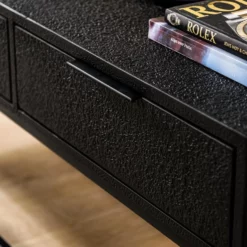 De Jinthe serie, van het woonmerk Vurna, bestaat uit diverse gave meubels. De serie is gemaakt van zwart staal. Dit geeft de Jinthe serie een stoere uitstraling. Doordat de serie zwart is, past deze in diverse woonstijlen. Zwarte meubels hebben ook een luxe uitstraling. Dit TV-meubel heeft een afmeting van B160xD35xH50 cm. Hij is voorzien van drie lades. Voldoende ruimte om spullen uit het zicht op te bergen. Mooi aan dit meubel is dat hij hoog op het onderstel staat. Dit zorgt voor een ruimtelijke uitstraling. Combineer dit tv-meubel met andere meubels uit de Jinthe-lijn van het woonmerk Vurna.