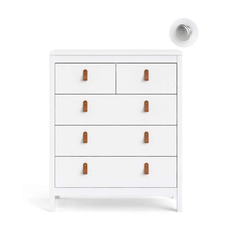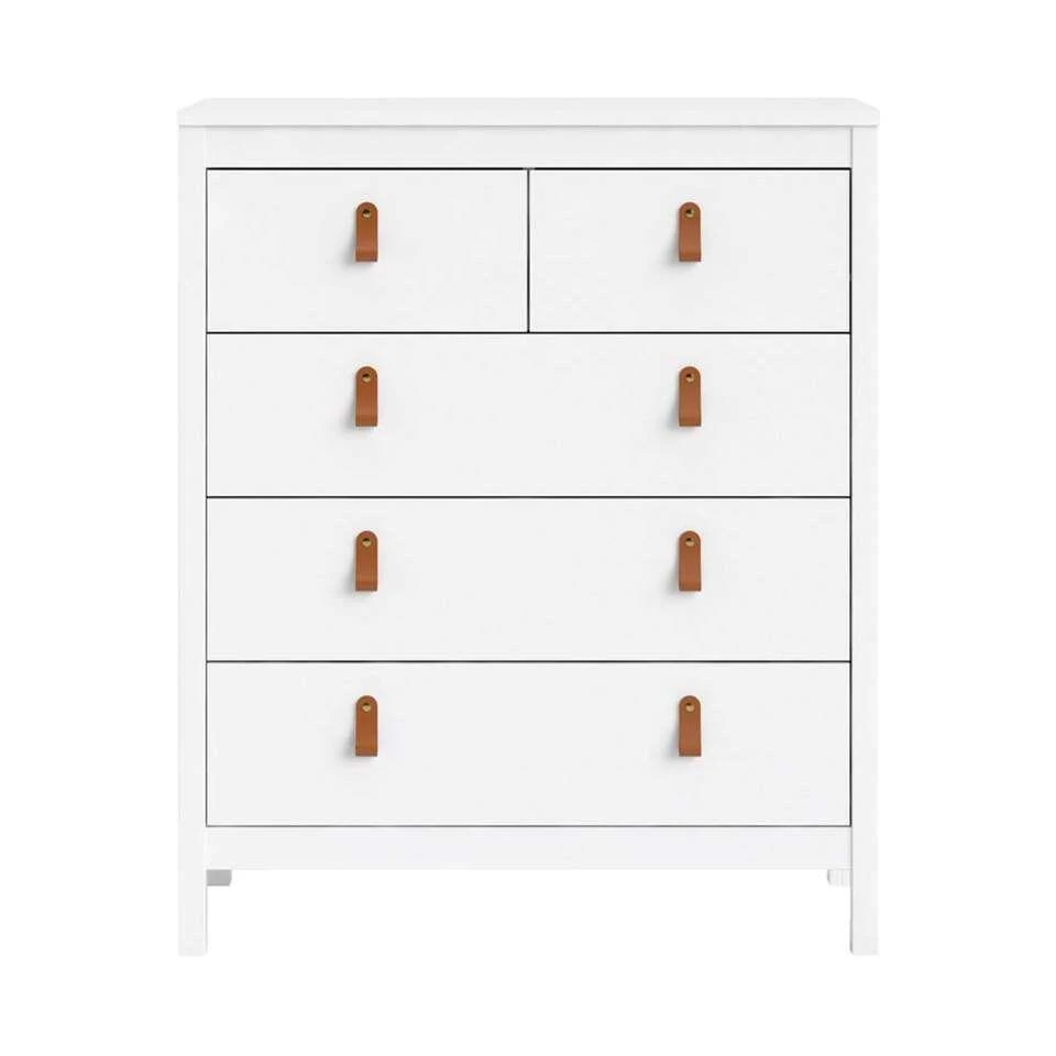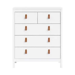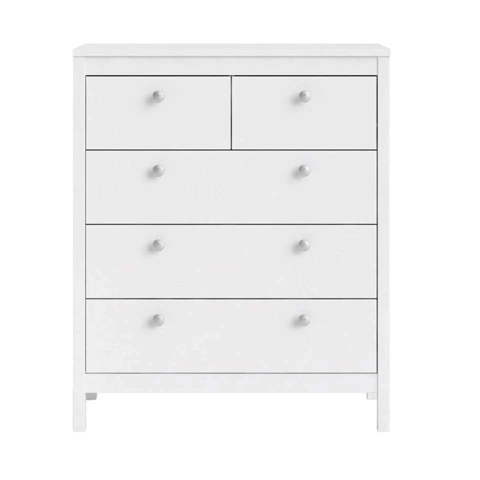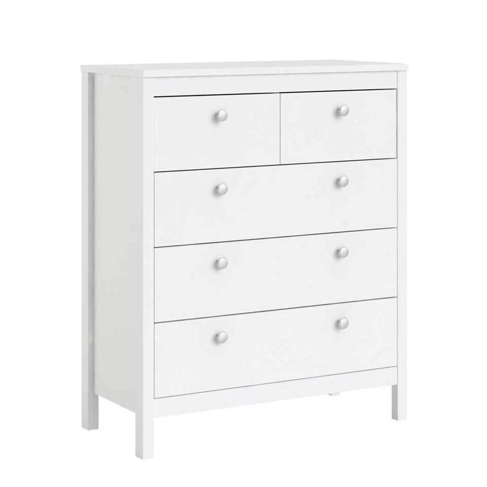 Kast Madeira heeft vijf lades en is 99x82x38 cm. Dit kastje heeft een landelijk stoere uitstraling en is wit van kleur. Dit praktische en veelzijdige kastje voelt zich uitstekend thuis in de woonkamer, slaapkamer, werkkamer of in de gang. Berg er van alles in op. Op de kast is ruimte voor leuke blikvangers en accessoires. Zet er bijvoorbeeld een stijlvolle vaas op of fotolijstjes met je favoriete kiekjes.