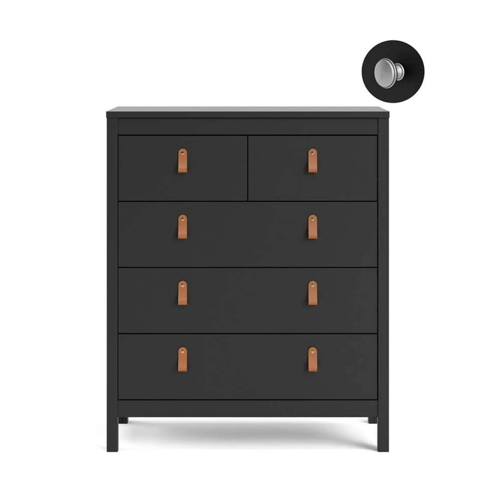 Kast Madeira heeft vijf lades en is 99x82x38 cm. Dit kastje heeft een landelijk stoere uitstraling en is zwart van kleur. Dit praktische en veelzijdige kastje voelt zich uitstekend thuis in de woonkamer, slaapkamer, werkkamer of in de gang. Berg er van alles in op. Op de kast is ruimte voor leuke blikvangers en accessoires. Zet er bijvoorbeeld een stijlvolle vaas op of fotolijstjes met je favoriete kiekjes.