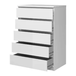 Ladekast Naia is een fijne kast voor de woonkamer of slaapkamer. De Naia heeft een strakke vormgeving in hoogglans wit en staat goed in elk modern interieur. De ladekast heeft maar liefst 5 laden, opbergen maar! Dit meubel is gemaakt van spaanplaat.