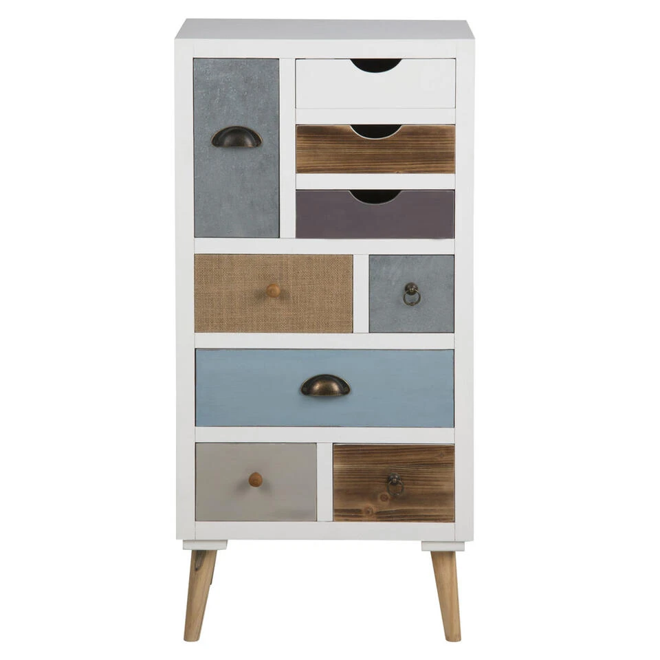 Ladekast Suomi is een te gekke kast passend in ieder interieur. Of je nu van landelijk, modern, romantisch of stoer houdt: deze ladekast zet je in je woonruimte en trekt meteen de aandacht. Deze kast heeft 9 lades, allemaal in een andere kleur of print met ander handvat. De sierlijke, eenvoudige houten poot maakt het geheel compleet. De hoogte van de poot is 15 cm. De totale afmeting (hxbxd) van deze kast is: 98x48x32 cm.