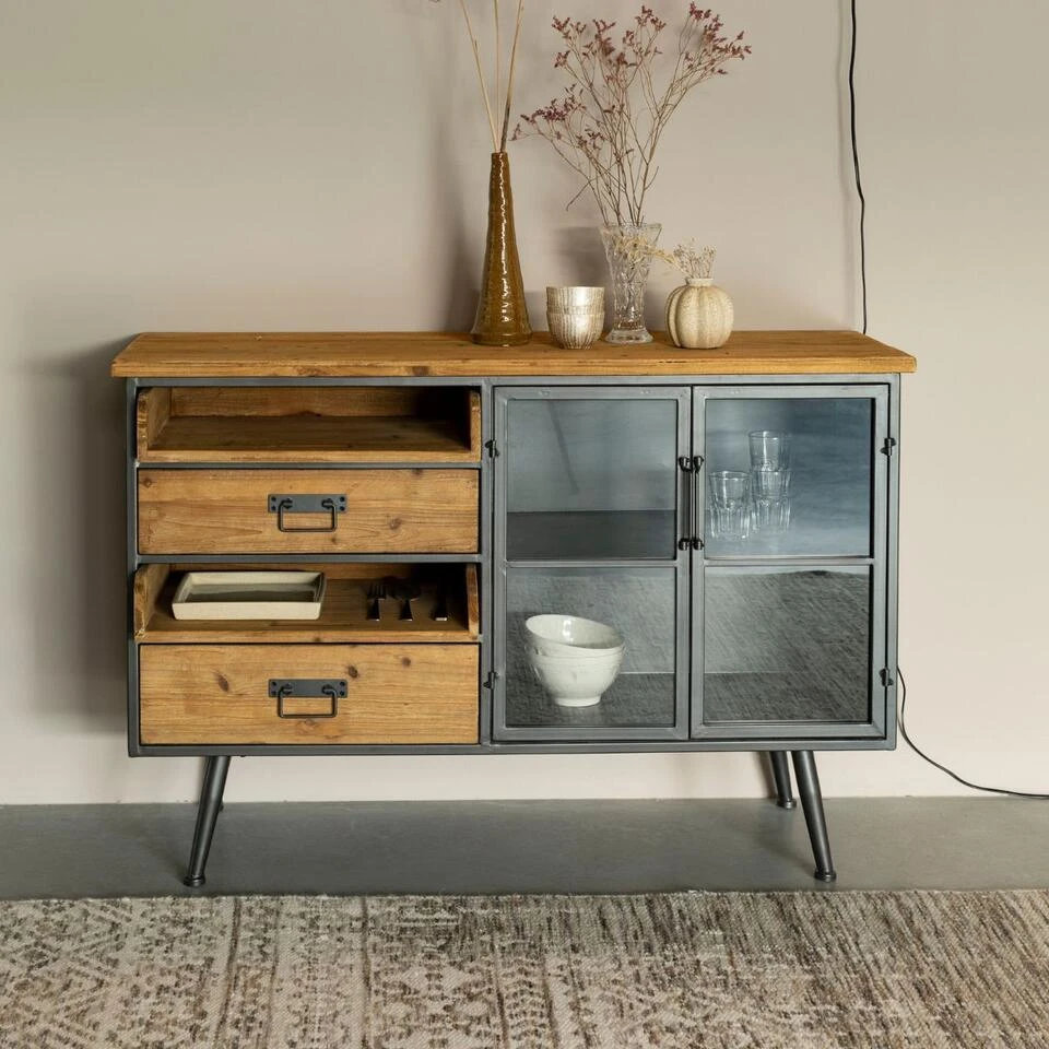 Het Dalarö dressoir is een prachtig meubelstuk dat zich onderscheidt door zijn elegante uitstraling en unieke ontwerp. Dit dressoir biedt veel verschillende opbergmogelijkheden, waardoor het een praktische en stijlvolle toevoeging is aan elke kamer. Met twee glazen deuren is het dressoir perfect om jouw mooie servies, glazen, of boeken tentoon te stellen en op te bergen. De twee lades, die gemaakt zijn van een combinatie van MDF en sparrenhout, bieden extra opbergruimte voor bijvoorbeeld jouw bestek, placemats of andere spullen die u graag uit het zicht wilt hebben. Het frame van het Dalarö dressoir is gemaakt van grijs gepoedercoat ijzer, wat zorgt voor een stevig en duurzaam geheel. De afmetingen van het dressoir zijn 75 cm in hoogte, 113 cm in breedte en 40 cm in diepte. Hierdoor past het dressoir perfect in verschillende interieurs en biedt het de ideale oplossing voor het opbergen van jouw spullen.