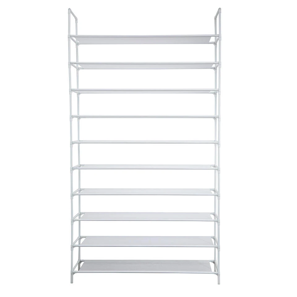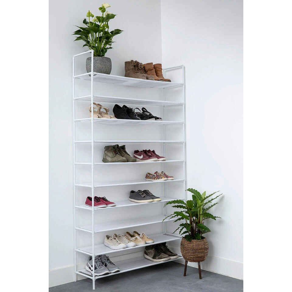 Met dit witte metalen schoenenrek geef je 50 paar schoenen een mooie plek in huis. Stevig en hoog, ideaal wanneer je veel schoenen in en kleine ruimte netjes wilt opbergen. Het vlies van de schappen is waterafstotend waardoor water van natte schoenen niet intrekt. Vuil als stof en zand veeg je bovendien gemakkelijk af met een vochtige doek. De poten zijn van kunststof zodat je geen krassen maakt op je vloer. Je zet het schoenenrek snel en makkelijk in elkaar. Het rek is verplaatsbaar, maar kan voor extra stevigheid ook met de bijgeleverde pluggen aan de muur worden bevestigd.