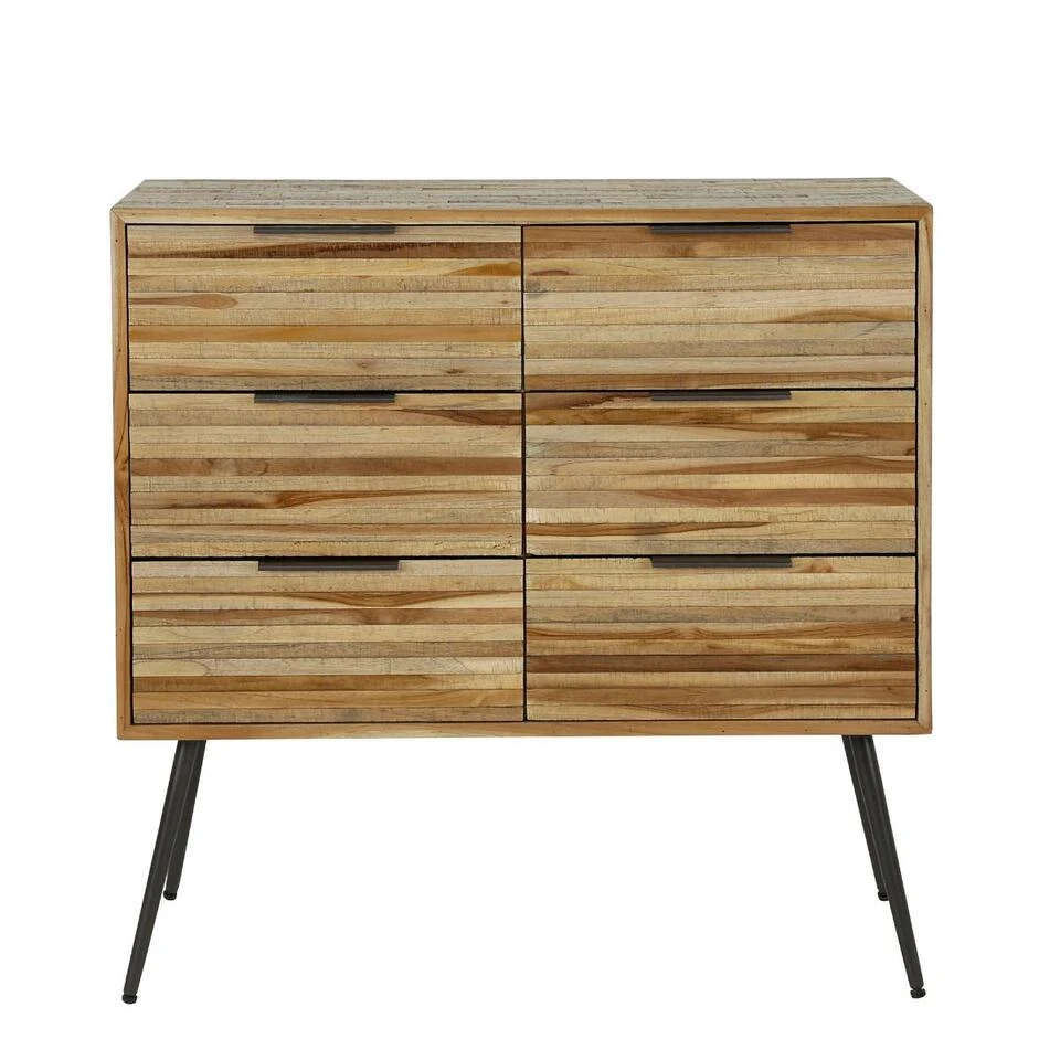 Sema ladekast 6 lades teakhout is uitgevoerd in verweerd teakhout, gelegd in strookjes met aan de voorzijde opgelegde strips van hetzelfde hout. Dit geeft een heel eigentijds en speels effect aan het kastje. De tapse pootjes zijn uitgevoerd in metaal. Deze betaalbare ladekast heeft 6 lades die van binnen zijn afgewerkt met glad hout in een donker grijze kleur. De ladekast maakt onderdeel uit van de Sema serie. De serie heeft een natuurlijke en warme uitstraling. De Sema-serie bestaat uit een nachtkastje, een haltafel, tv meubel en twee ladekasten (met drie lades of zes lades). Combineer deze diverse meubels voor eenheid binnen het interieur.