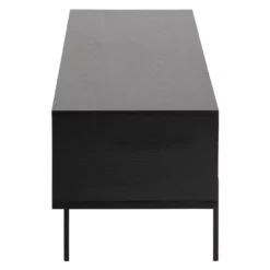 Gekenmerkt door strakke lijnen en een lichte structuur is deze TV-standaard in zwart essenhout een stoere, moderne toevoeging aan elke woonruimte. Ruwe gepoedercoate metalen poten ondersteunen de TV-tafel die gemakkelijk schoon te vegen is. Let op de mesh schuifdeuren. Het voegt een extra stijlvol element toe aan het meubel en biedt veel opbergruimte.