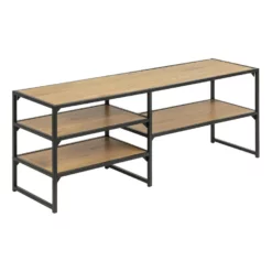 Een tv-meubel dat gekenmerkt wordt door een rechtlijnig ontwerp en open opbergruimte voor je entertainmentmedia. Gemaakt in moderne industriële stijl, heeft het een zwart metalen frame en 3 planken in een wilde eiken look. De asymmetrische positie van de planken verhoogt ook het visuele belang. Zo’n combinatie brengt een contrasterend element in de kamer en houdt je media in de schijnwerpers.