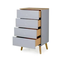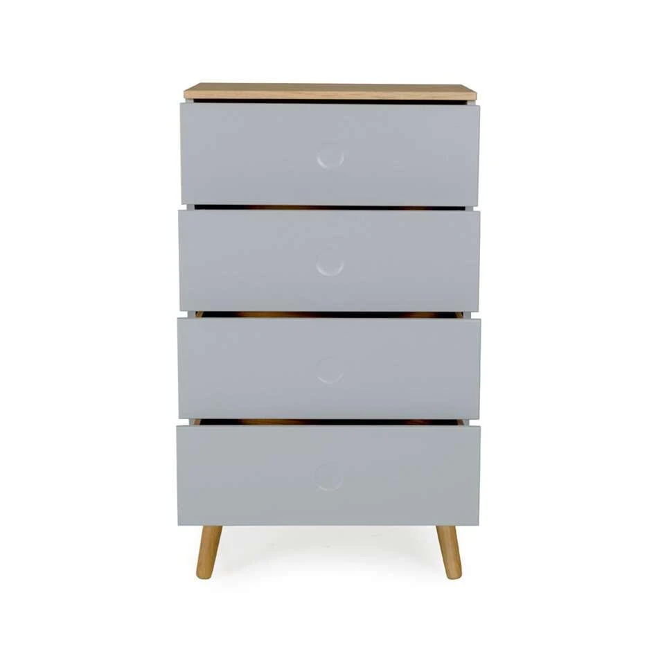 Tenzo ladekast Dot 4 lades is grijs met eiken en heeft een afmeting van 98x55x43 cm. Deze ladekast wordt gekenmerkt door een Scandinavisch design. De kast heeft 4 ruime lades voor het opbergen van allerlei losse spullen. De afmetingen van de binnenlades zijn 12,7×47,5×37,5cm. Bovenop is voldoende ruimte voor leuke accessoires zoals foto’s, waxinelichthouders, kandelaars en decoratieve vaasjes.