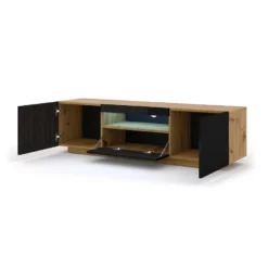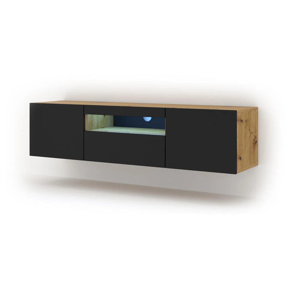 Universele tv-kast, ideaal voor de woonkamer of jeugdkamer. De kast is universeel – hij kan aan de muur worden gehangen of staan (hij heeft plinten die optioneel kunnen worden gemonteerd). De kast is gemaakt in een moderne stijl. Hij heeft één open plank (plaatsen voor settopboxen of consoles) en drie afsluitbare vakken (twee open aan de zijkanten en één aan de onderkant)