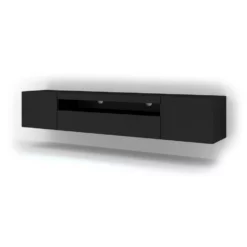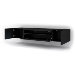 Universele tv-kast, ideaal voor de woonkamer of jeugdkamer. De kast is universeel – hij kan aan de muur worden gehangen of staan (hij heeft plinten die optioneel kunnen worden gemonteerd). De kast is gemaakt in een moderne stijl. Hij heeft één open plank (plaatsen voor settopboxen of consoles) en drie afsluitbare vakken (twee open aan de zijkanten en één aan de onderkant)