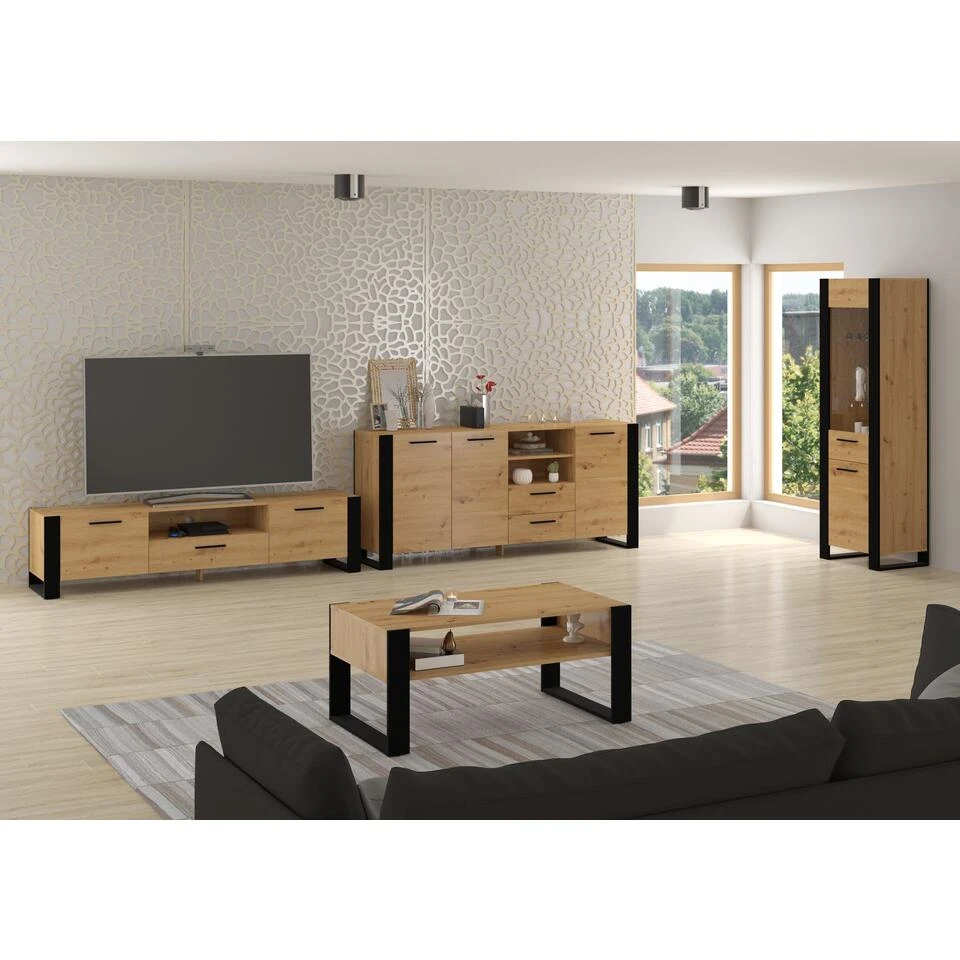 Zeer elegante en stijlvolle tv-kast voor in de woonkamer. Hij kenmerkt zich door een moderne en oogstrelende uitstraling – zijn charme zijn de grote zwarte poten in de vorm van een frame, die prachtig contrasteren met de rest van het meubel. De kast heeft drie gesloten planken en een open plank voor decoders of consoles.
