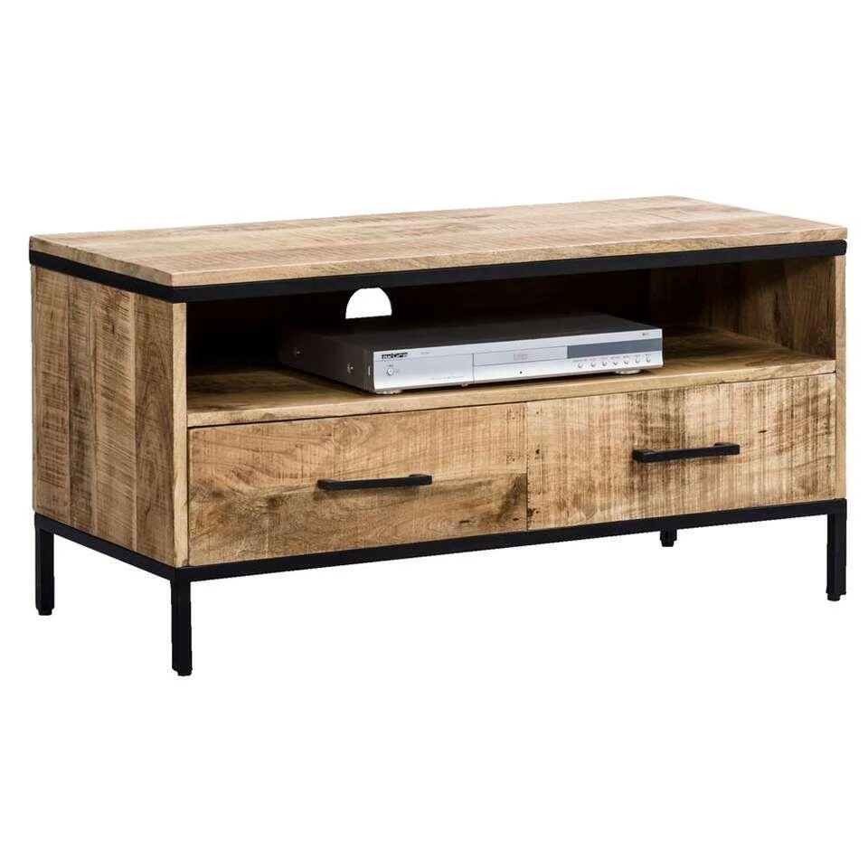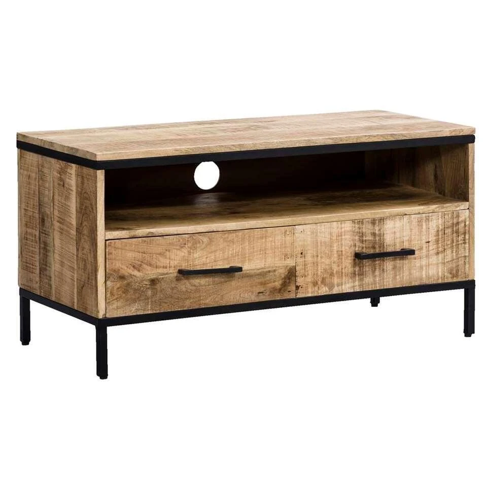 Tv-meubel Trevor is een stoer dressoir gemaakt van mangohout en metaal. Dit tv-meubel beschikt over twee grote lades en een open vak. Hier is ruimte voor bijvoorbeeld een receiver, HD-ontvanger of een router. Alle bijbehorende kabels trek je eenvoudig door het gat aan de achterkant naar buiten. Het tv-meubel staat stevig op zwart gekleurde metalen poten.